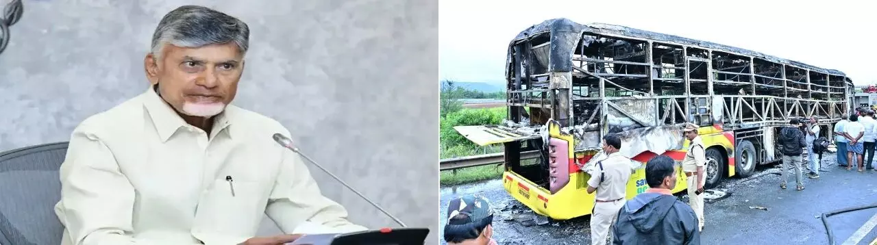 Chandrababu on Kurnool Bus Accident: కర్నూలు బస్సు దుర్ఘటన ఘటన నేపథ్యంలో ఇతర రాష్ట్రాల రవాణా శాఖ మంత్రులు, అధికారులతో కలిసి సమగ్ర విచారణ చేపట్టాలని ఆంధ్రప్రదేశ్ ముఖ్యమంత్రి చంద్రబాబు నాయుడు ఆదేశాలు జారీ చేశారు. మంత్రి మండిపల్లి రామప్రసాద్ రెడ్డి, అధికారులతో కలిసి ఆయన వీడియో కాన్ఫరెన్స్ నిర్వహించారు. ఈ ఘటనలో ప్రాణాలు కోల్పోయిన వారి వివరాలను త్వరగా గుర్తించి, మృతుల కుటుంబాలకు తక్షణమే సహాయం అందించాలని సూచించారు. అలాగే, తీవ్ర గాయాలతో చికిత్స పొందుతున్న ప్రయాణికులకు అత్యుత్తమ వైద్య సదుపాయాలు కల్పించేలా అధికారులకు ఆదేశాలు జారీ చేశారు.