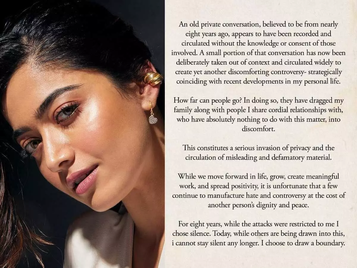 తన వ్యక్తిగత జీవితంలో కొత్త అధ్యాయంప్రారంభమైన తరుణంలో, పనిగట్టుకుని ఇలాంటి పాత విషయాలను బయటకు తీయడం వెనుక దురుద్దేశం ఉందని రష్మిక ఆవేదన వ్యక్తం చేశారు. ఆ ఆడియో క్లిప్ సంబంధిత వ్యక్తుల అనుమతి లేకుండా రికార్డ్ చేసినదని, ఇది ముమ్మాటికీ ప్రైవసీకి భంగం కలిగించడమేనని ఆమె పేర్కొన్నారు. అంతేకాకుండా, పెద్ద సంభాషణలో ఒక చిన్న భాగాన్ని మాత్రమే కట్ చేసి, సందర్భం లేకుండా ప్రచారం చేస్తూ వివాదాలు సృష్టించే ప్రయత్నం చేస్తున్నారని ఆమె మండిపడ్డారు.
