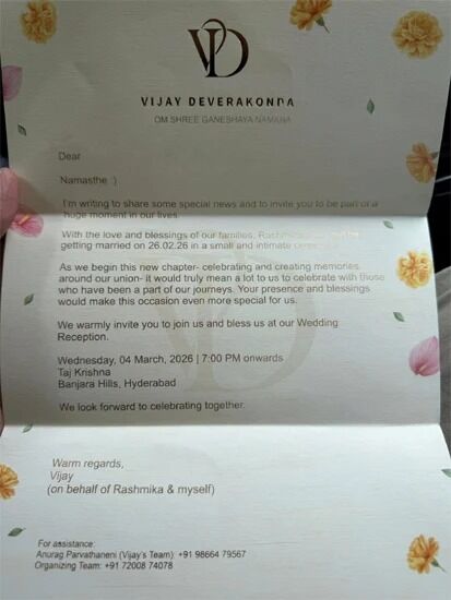 Vijay and Rashmika’s Wedding: సిని హీరో విజయ్ దేవరకొండ రష్మిక మందన్న పెళ్లి ఈ నెల 26 న ప్రఖ్యాత ఉదయ్ పూర్ ప్యా లెస్లో వీరి వివాహం జరగ నుందని తెలుస్తోంది. వీరి పెళ్లికి సంబంధించిన ఆహ్వాన పత్రం సోషల్ మీడియాలో వైరల్ అవుతోంది. వచ్చే నెల 4న హైదరాబాద్ లోని తాజ్ కృష్ణలో వీరి వివాహ రిసెప్షన్ ఏర్పాటు చేసినట్టు కార్డులో ఉంది. ఫిబ్రవరి 20 నాటికి ఇరు కుటుంబాలు ఉద ష్ఫూర్కు చేరుకుని.. 22వ తేదీ నుంచి హల్దీ, మెహందీ, సంగీత్ లాంటి వేడుకల్లో పా ల్గొంటారని ఊహాగానాలు వినిపిస్తున్నాయి. 26వ తేదీనపెళ్లి చేసుకుని.. హైదరాబాద్కు వచ్చిన తర్వాత మార్చి 4న సాయంత్రం 7 గంటలకు తాజ్ కృష్ణాలోసినీ, రాజకీయ, ఇతర ప్రముఖులకు గ్రాండ్ రిసెప్షన్ ఇవ్వనున్నట్టు ఆ కార్డులో ఉంది.