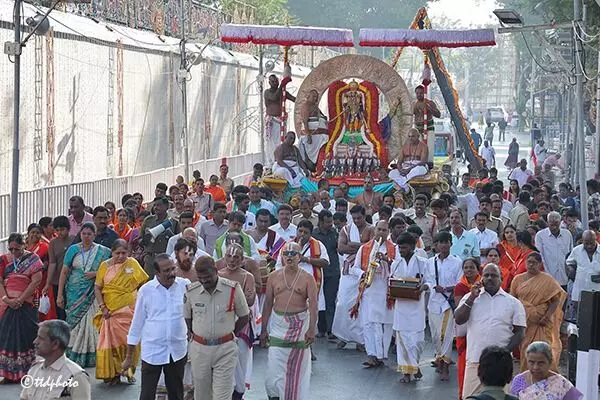 Sri Kalyana Venkateswara Swamy Brahmotsavam: శ్రీనివాసమంగాపురం శ్రీకల్యాణ వేంకటేశ్వరస్వామి వారి బ్రహ్మోత్సవాల్లో ఏడో రోజైన శనివారం ఉదయం 8 గంటలకు ఆదిత్య మండలం సూర్యప్రభ వాహనంపై ఖడ్గం, గద, విల్లు ధరించి శ్రీ సూర్యరాయణస్వామి అలంకారంలో భక్తులకు దర్శనమిచ్చారు. వాహనసేవ ముందు గజరాజులు నడుస్తుండగా, భక్తజన బృందాలు చెక్క భజనలు, కోలాటాలతో స్వామివారిని కీర్తిస్తుండగా, మంగళవాయిద్యాల నడుమ స్వామివారి ఉత్సవం కోలాహలంగా జరిగింది. భక్తులు అడుగడుగునా కర్పూర హారతులు సమర్పించి స్వామివారిని దర్శించుకున్నారు.