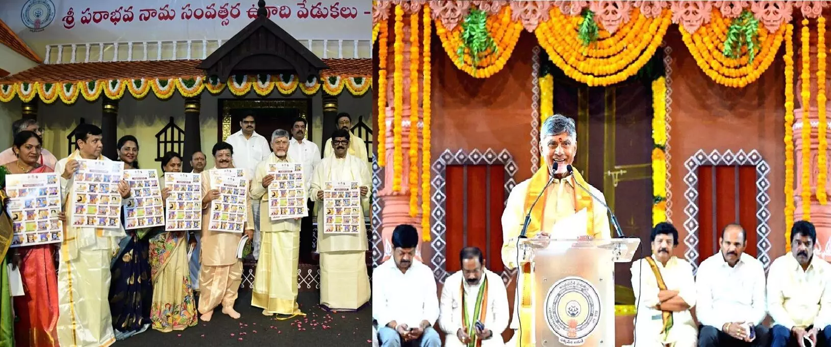 విజయవాడలోని తుమ్మలపల్లి కళాక్షేత్రంలో రాష్ట్ర ప్రభుత్వం ఆధ్వర్యంలో నిర్వహించిన శ్రీ పరాభవ నామ సంవత్సర ఉగాది వేడుకల్లో సీఎం చంద్రబాబు పాల్గొన్నారు. ఈ సందర్భంగా పండితులు మాడుగుల నాగఫణి శర్మ పంచాంగ శ్రవణం చేశారు. ఆ తర్వాత సీఎం మాట్లాడుతూ..