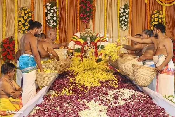 ఈ యాగం కోసం ఆంధ్రప్రదేశ్, తమిళనాడు, కర్ణాటక రాష్ట్రాల నుండి భక్తులు సుమారు 3 టన్నుల రంగురంగుల పుష్పాలను విరాళంగా అందజేశారు. తులసీదళాలు, మల్లెలు, రోజాలు, చామంతులు, గన్నేరు, సంపంగి, మొగలి దళం వంటి రకరకాల పూలతో స్వామివారు మరియు అమ్మవారికి పుష్పనీరాజనం సమర్పించారు. గర్భాలయం మొత్తం పుష్ప సౌరభంతో నిండిపోయి భక్తులకు కనువిందు కలిగించింది.