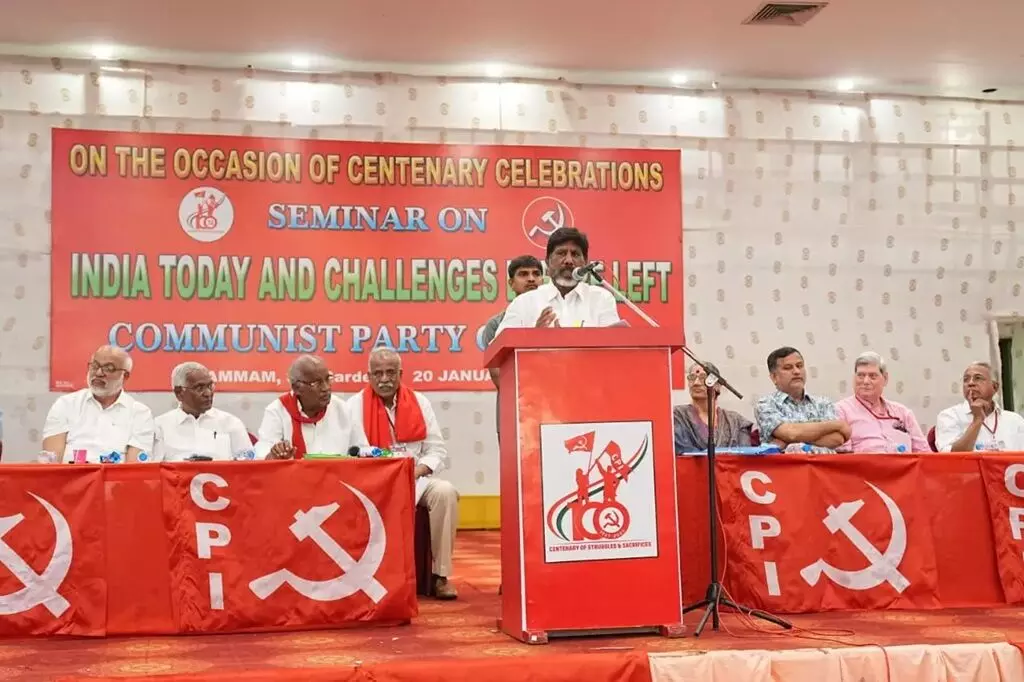కార్యక్రమంలో మాట్లాడిన తెలంగాణ ఉప ముఖ్యమంత్రి మల్లు భట్టి విక్రమార్క.. భాజపా ప్రభుత్వం రాజ్యాంగంలో మార్పులు చేయాలని కుట్ర చేస్తోందని మండిపడ్డారు. రాజ్యాంగ రక్షణే సామాన్యుల హక్కులకు హామీ అని, కార్పొరేట్, ఫాసిస్టు శక్తుల సవాళ్లకు అడ్డుకట్ట వేయాలంటే ఐక్య పోరాటాలు తప్పనిసరని అన్నారు. వామపక్ష భావజాలం ఉన్న పార్టీలు బలంగా ఉండాల్సిన అవసరం ఉందని పేర్కొన్నారు. స్వాతంత్య్ర సమరంలో సీపీఐ కీలక పాత్ర పోషించిందని, సాయుధ రైతాంగ పోరాటం ప్రపంచానికి కొత్త సందేశం ఇచ్చిందని గుర్తుచేశారు.